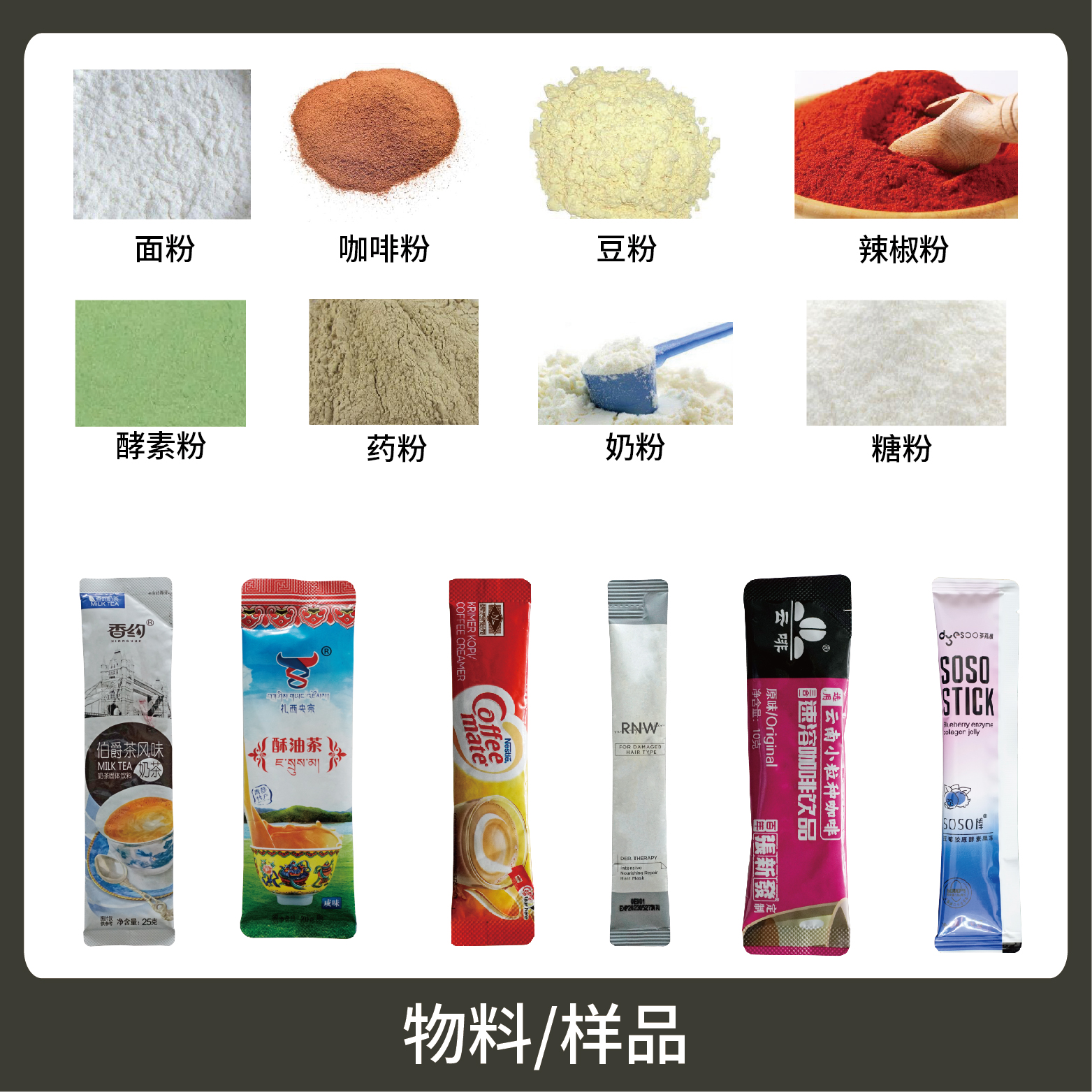 適用于食品、醫(yī)藥、化工、化妝品行業(yè)中粉劑等物品的計(jì)量包裝,如:奶粉、藥粉、咖啡粉、蛋白質(zhì)粉等。